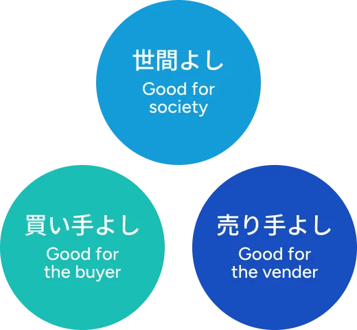 小泉成器(コイズミグループ)は、近江商人独特の商道徳である三方よしの精神を小泉創業以来そのDNAを受け継いでいます。三方よしとは、売り手と買い手が共に満足し、また社会にも貢献するのが良い商売であるという意味であり、当社は今もなおその思想を受け継いでいます。近江商人は広域志向の商人であり、本店を中心に全国へ販売網を展開させるという手法で活動領域は全国各地に及んでいました。このことからも他の土地に入り込むという事は、信用信頼を得ることが最優先と考えられ、三方よしの思想に繋がっています。