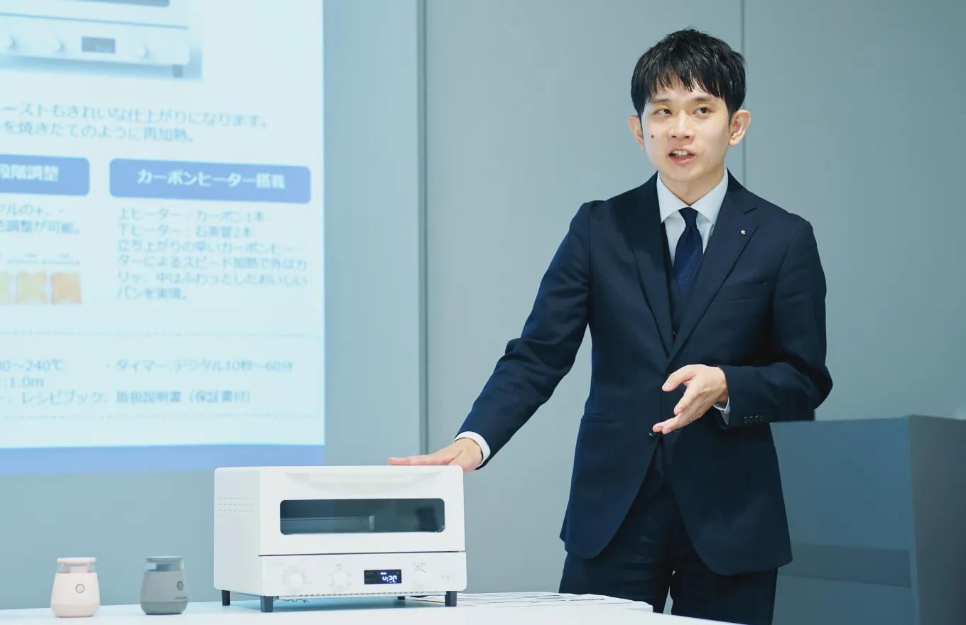 2025年4月からは商品部に配属され、調理家電・音響・家事家電のカテゴリーを担当しています。業務内容としては、市場分析を行い、どのような商品を開発すべきかを判断し、協力工場や開発部門をはじめとする社内外の関係者を巻き込んで商品を具現化していくというものです。営業時代に得たバイヤーの方たちの声や、ECで得たエンドユーザーの皆さんのレビューが商品コンセプトを決める際の土台となっていると実感しています。
